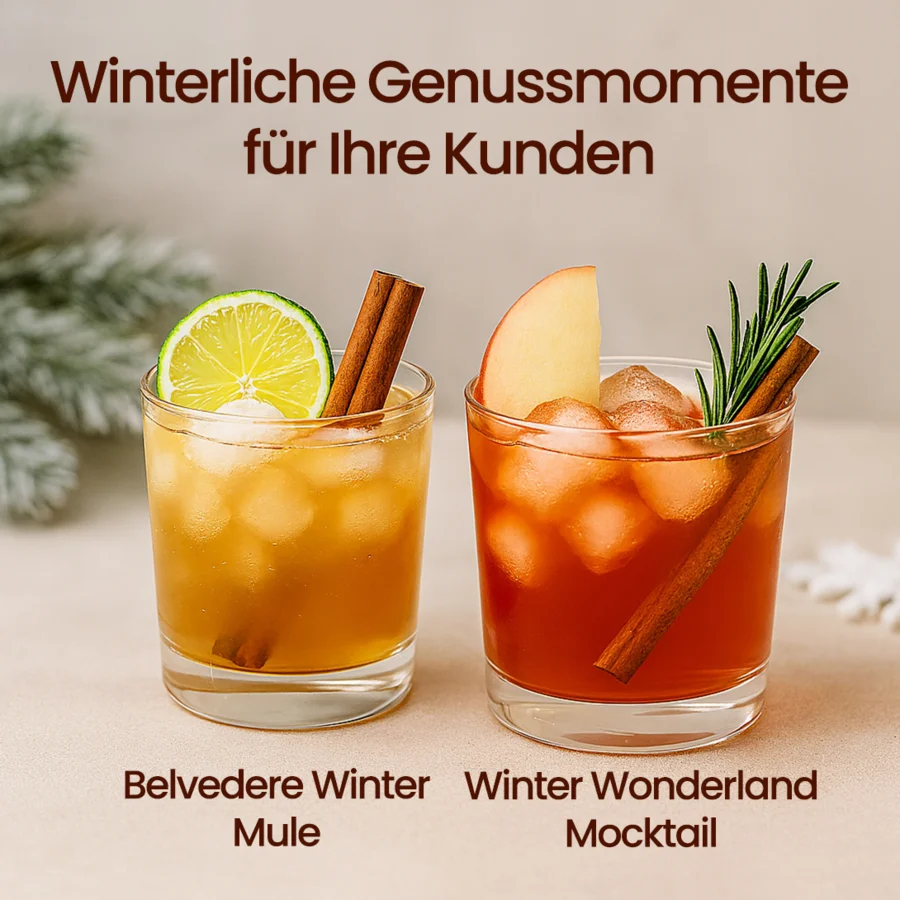 Ein würzig-frischer Cocktail mit Zimt und eine alkoholfreie Variante – fruchtig, aromatisch und winterlich. Zwei Drinks, die Wärme und Festlichkeit ins Glas bringen.
